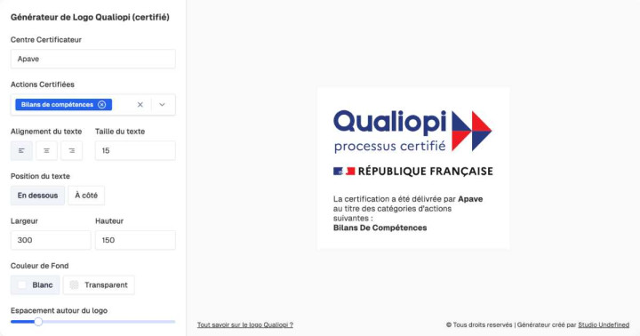 Créez facilement votre logo Qualiopi certifié en quelques clics. Choisissez parmi plusieurs formats (PNG, JPG, transparent) et personnalisez-le en conformité avec les normes. Obtenez un logo adapté pour vos formations, VAE et bilans de compétences.